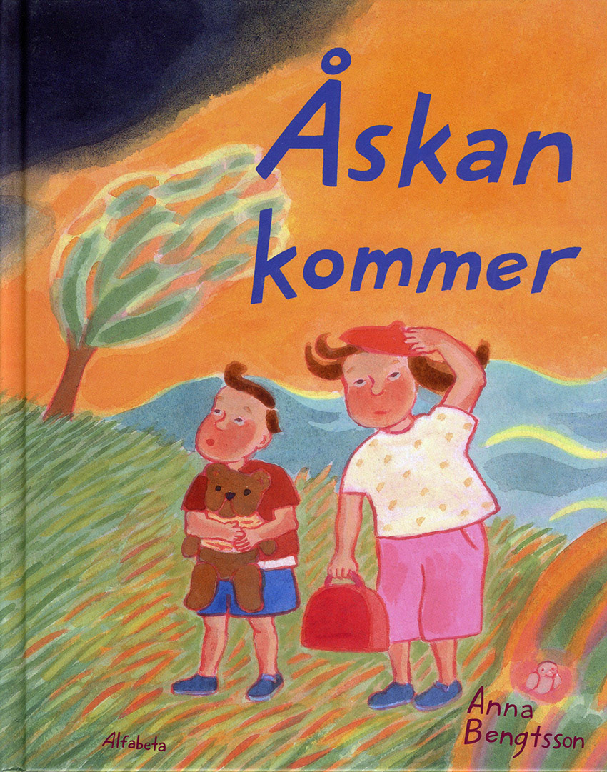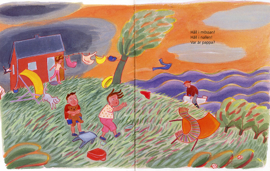 Solen lyser, barnen leker med nallen. Men så kommer molnen, det börjar blåsa och regna. Löven prasslar, spindlarna och småfåglarna gömmer sig. Och så kommer dundret ...